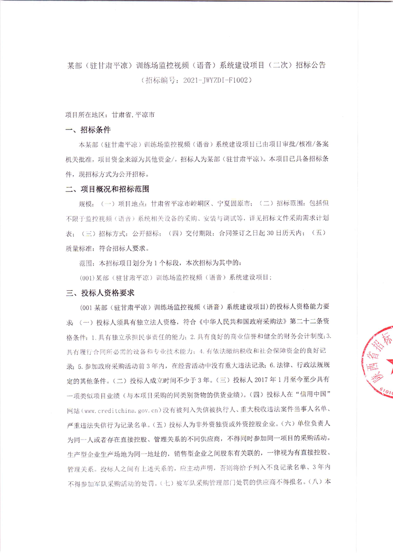 某部(驻甘肃平凉)训练场监控视频(语音)系统建设项目(二次)