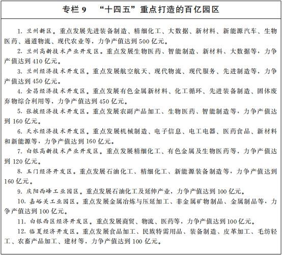 打造百亿园区。依托各级开发区等重大平台和载体,全面提升园区基础设施和服务能力,积极承接产业转移,吸纳“飞地经济”。抓住承接产业转移重要窗口期,建立承接产业转移协调落实机制,完善信息对接、权益分享、税收分成体系,千方百计承接符合产业政策、环保政策、适合我省发展的产业。充分发挥要素成本、资源和通道等优势,集中优质要素向园区配置,引导产业项目在园区落地。加强衔接对接、定点招商、精准招商,落地一批大项目好项目,推动产业园区化、园区产业化。重点打造12个百亿园区。积极培育发展潜力较大的陇西经济开发区、武威民勤能源化工工业集中区、金塔工业集中区、定西经济开发区、平凉工业园区、陇南经济开发区、甘南合作生态产业园区等,成为区域产业集聚重要平台。
