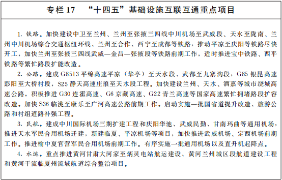 高质量发展迈出重要步伐。经济综合实力持续增强,地区生产总值由2015年的6557亿元增加到2020年的9016.7亿元。结构调整和转型升级深入推进,粮食生产连年丰收,稳定在1200万吨以上,现代丝路寒旱农业蓬勃发展,以“牛羊菜果薯药”为代表的优势特色产业种养规模不断扩大,“厚道甘肃·地道甘味”美誉度和影响力大幅提升;传统产业“三化”改造步伐加快,外送电量大幅增长,常乐电厂、酒钢7号高炉、宝方炭材超高功率石墨电极生产线等一大批重大产业项目竣工投产;兰州新区等增长极快速成长,产业人口集聚初具规模;十大生态产业增加值占全省生产总值比重达到24.2%,服务业占比超过55%。基础设施条件进一步改善,宝兰高铁、银西高铁、兰渝铁路、敦格铁路、兰州轨道交通1号线一期工程,白明、景中、两徽、张扁高速公路,陇南成县机场等一大批标志性工程建成投运;中川国际机场三期扩建,中川至武威高铁、西成铁路、天陇铁路,敦当、彭大、平天、武九高速公路,甘肃中部生态移民扶贫开发供水等重大工程项目相继开工;全省互联网出口带宽五年增加828%,农村地区光纤和4G网络覆盖率均达到99%以上。