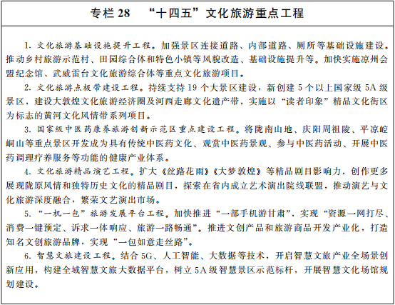 推动文化产业和旅游产业加快发展。深度开发旅游资源,创新旅游业态,统筹线下线上旅游,推出高端多元旅游产品。推动文化旅游与康养、美丽乡村、体育、金融等产业融合发展,支持各类文化企业打造旅游驻场演出项目,有效提升旅游品质。进一步扩大公祭伏羲大典国际影响力,打造黄河流域中华人文始祖发源地文化品牌。放大丝绸之路(敦煌)文化博览会平台综合效应,办好敦煌行·丝绸之路国际旅游节、“一带一路”美丽乡村论坛等重大节会。打造更多世界级精品景区、精品线路、国家级休闲城市。创建一批5A级、4A级景区和国家级、省级度假区。发展全域旅游,促进红色旅游和乡村旅游提档升级。有序发展生态观光旅游,推动生态保护与旅游发展相得益彰。大力发展假日经济和冬日经济,加快发展健身休闲和体育竞赛表演产业,提升高原特色体育产业和冰雪运动影响力。开发具有地方特色的文创产品和纪念品。拓展国际旅游市场,提升对境外游客吸引力。全面开放旅游市场,建设和引进一批国内外知名旅游企业和管理服务品牌。放大文化旅游业综合效应。“十四五”期间,力争旅游综合收入年均增长20%以上。