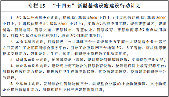 加快新基建步伐。打造面向“一带一路”沿线国家和地区的通信枢纽、区域信息汇集中心和大数据服务输出地,加快以5G等新一代信息技术为代表的新型基础设施建设。优化骨干传输网络,建设兰州至成都第二路由等国家一级干线。健全基础网络架构,构建覆盖全省、技术先进、安全可靠的信息通信网络。争取到2025年实现5G网络人口覆盖率达到50%以上。推进工业互联网建设,完成IPv6规模部署。加强新技术基础设施和算力基础设施建设,建设区域智能计算中心,合理布局大数据中心,积极开展国际物联网骨干直联点、国际通信业务出入口局前期工作。发挥我省能源丰富、气候适宜的优势,积极争取在甘肃布局全国一体化大数据中心国家枢纽节点。开展工业互联网标识解析二级节点应用和试点示范工程。