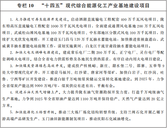 推进传统能源绿色清洁高效发展。加大煤炭油气勘探、综合开发和清洁高效利用力度,有序释放先进产能。推动陇东综合能源化工基地高质量发展,着力打造以煤炭、电力产业为支撑的国家大型煤炭基地、千万千瓦级火电基地、千万吨级油气生产基地、煤化工基地,重点建设灵台、宁正、沙井子等矿区。充分发挥煤电基础性、调节性电源作用,做好煤电布局和结构优化,加快推进配套调峰火电和煤源项目建设,有序启动内用火电及热电联产项目,深入推进火电机组灵活性改造,充分挖掘系统调峰能力,持续加大电力外送。多措并举提升煤电机组运行效率,推动煤电行业清洁高效发展。