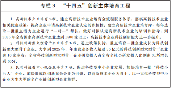 强化企业创新主体地位。促进各类创新要素向企业集聚,发挥规模以上企业引领支撑作用,培育壮大科技型中小微企业群体。支持企业加大研发投入。强化企业在关键技术攻关中的主体作用,鼓励企业和科研机构联合建立创新平台,支持若干大型企业牵头组建创新联合体,辐射带动中小企业开展创新活动。实施科技型企业梯度培育计划,加快培育一批瞪羚企业、独角兽企业和科技型中小企业,做强行业领军创新型企业,推动产业链上中下游、大中小企业融通创新。