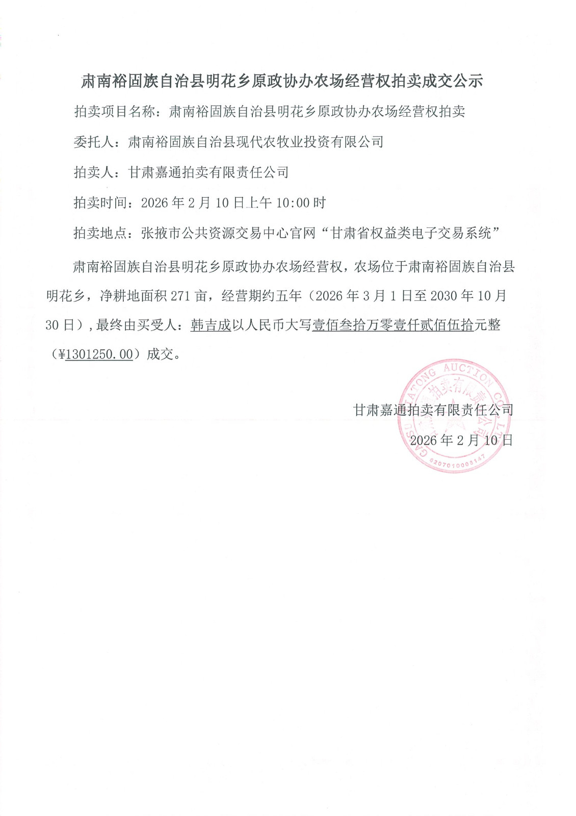 肃南裕固族自治县明花乡原政协办农场经营权,农场位于肃南裕固族自治县明花乡,净耕地面积271亩,经营期约五年(2026年3月1日至2030年10月30日),最终由买受人:韩吉成以人民币大写壹佰叁拾万零壹仟贰佰伍拾元整 (¥1301250.00)成交。