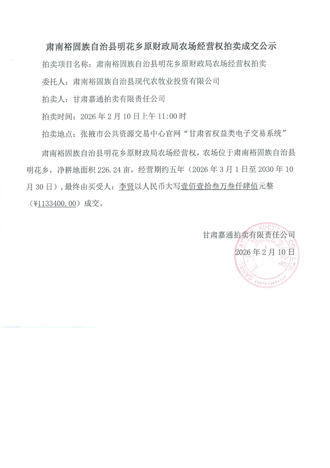 肃南裕固族自治县明花乡原财政局农场经营权拍卖成交公示