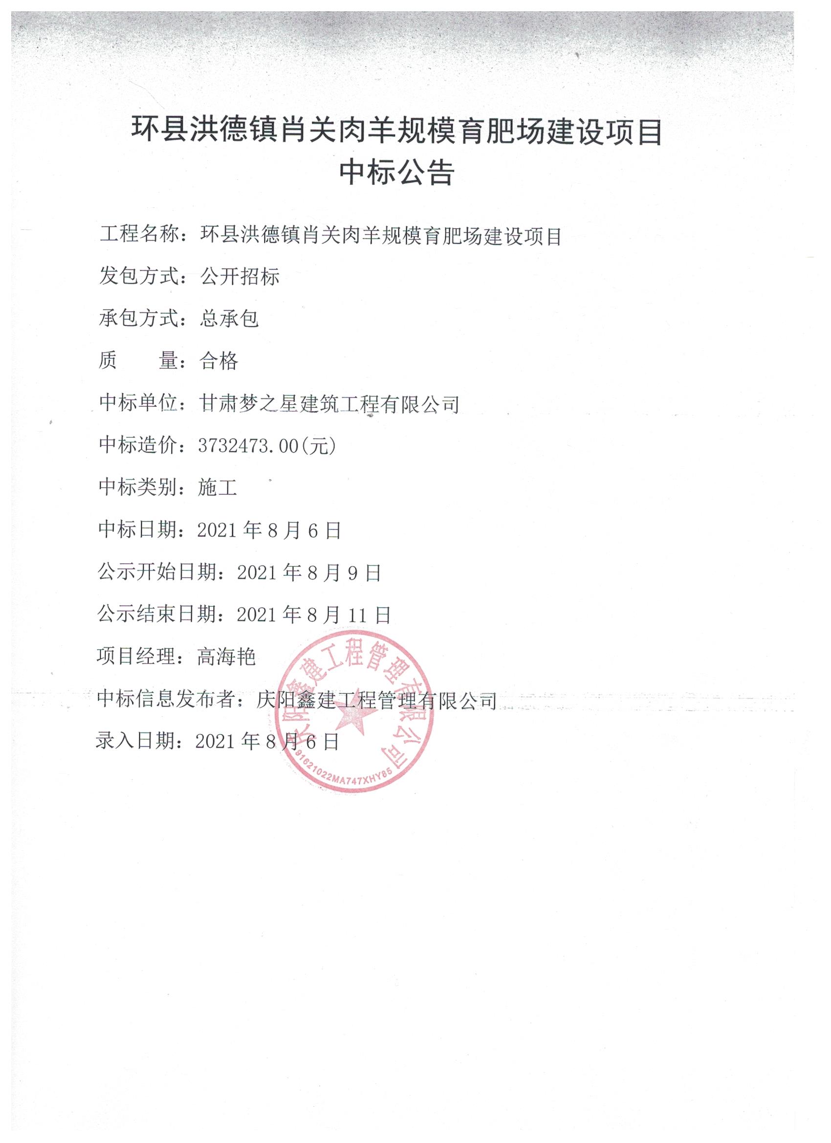 - 2021-08-09环县洪德镇肖关肉羊规模育肥场建设项目中标公示
