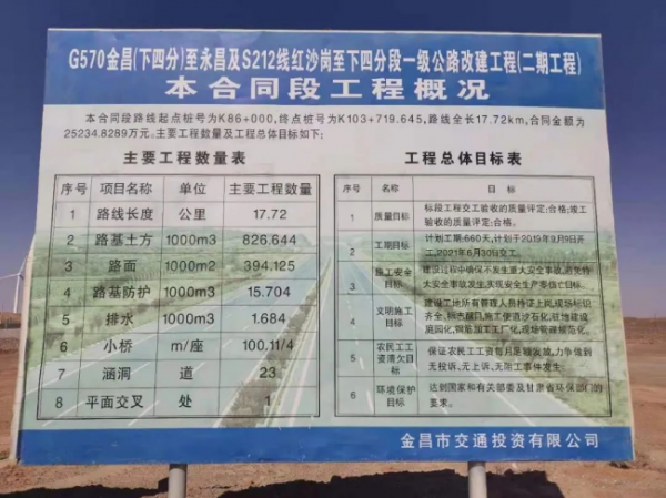 G570一级公路改建工程为《国家公路网规划(2013年~2030年)》新规划的国道。G570的建成,它既是贯通金昌与永昌之间的一条便捷通道,也是金昌市与武威市民勤县、内蒙自治区阿拉善右旗之间的一条重要连接线。对加快我市城乡一体化进程,改善我市“一区三园”间的交通运输状况,促进区域经济社会全面发展均有着十分重要的作用。