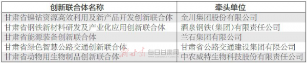 为加快创新甘肃建设,增强企业技术创新能力,实现企业、高校和科研院所的有机结合,形成体系化、任务型的协同创新模式,省科技厅、省工信厅3月29日联合发布《关于核准甘肃省第一批企业创新联合体的公告》,同意金川集团股份有限公司、酒泉钢铁(集团)有限责任公司、兰石集团有限公司、甘肃省公路交通建设集团有限公司、中农威特生物科技股份有限责任公司等5家企业牵头组建企业创新联合体。(掌上兰州·兰州晨报首席记者武永明)