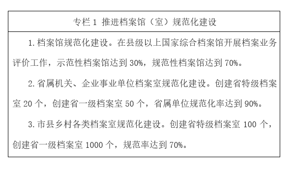 档案资源建设迈出新步伐。档案资源覆盖面更加广泛、内容更加丰富、形式更加多样、结构更加优化,档案“应归尽归、应收尽收”有效落实。到“十四五”末,省档案馆馆藏数量比“十三五”末增长35%,市县国家综合档案馆增长30%,机关、企事业单位、乡村档案馆(室)归档率达到100%。