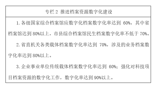 9.加快档案资源数字化进程。加强档案数字资源规划管理,逐步建立以档案数字资源为主导的档案资源体系。大力推进“增量电子化”,促进各类电子文件应归尽归,电子档案应收尽收,省市档案馆全部具备电子档案接收能力,电子档案在档案资源体系中占比明显提升。继续做好“存量数字化”,加快推进馆藏、室藏档案数字化工作进度。推动重要档案数字化成果文字识别和语音识别工作。