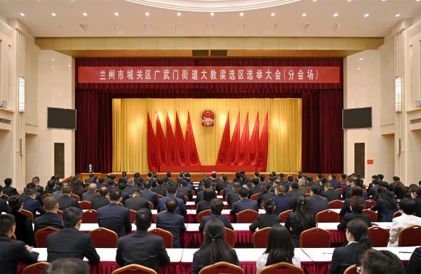 城关区广武门街道大教梁选区选举大会(分会场)国徽高悬、熠熠生辉,十面鲜艳的红旗分列两侧,红色的票箱端放正中,现场气氛庄重而热烈。