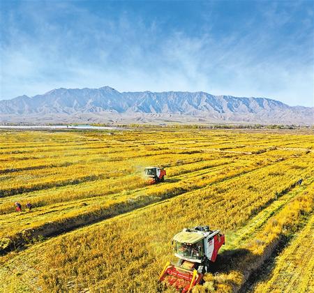 甘州区花寨小米种植专业合作社的农户正在收割绿色有机无公害谷子。(资料图 通讯员王将)
