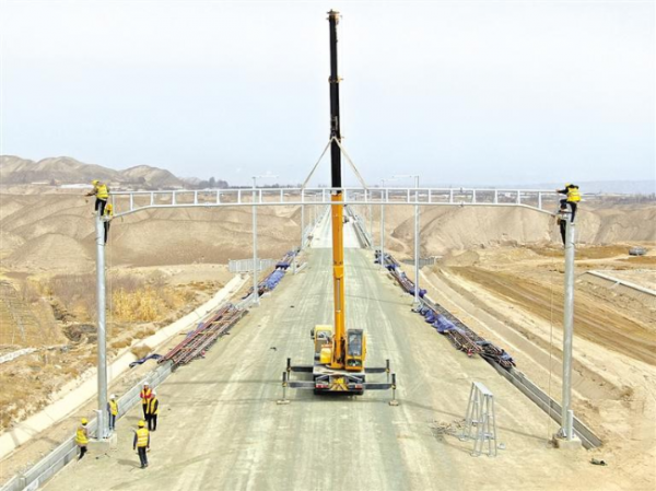 新建中兰客专(甘肃段)首组接触网硬横梁成功架设