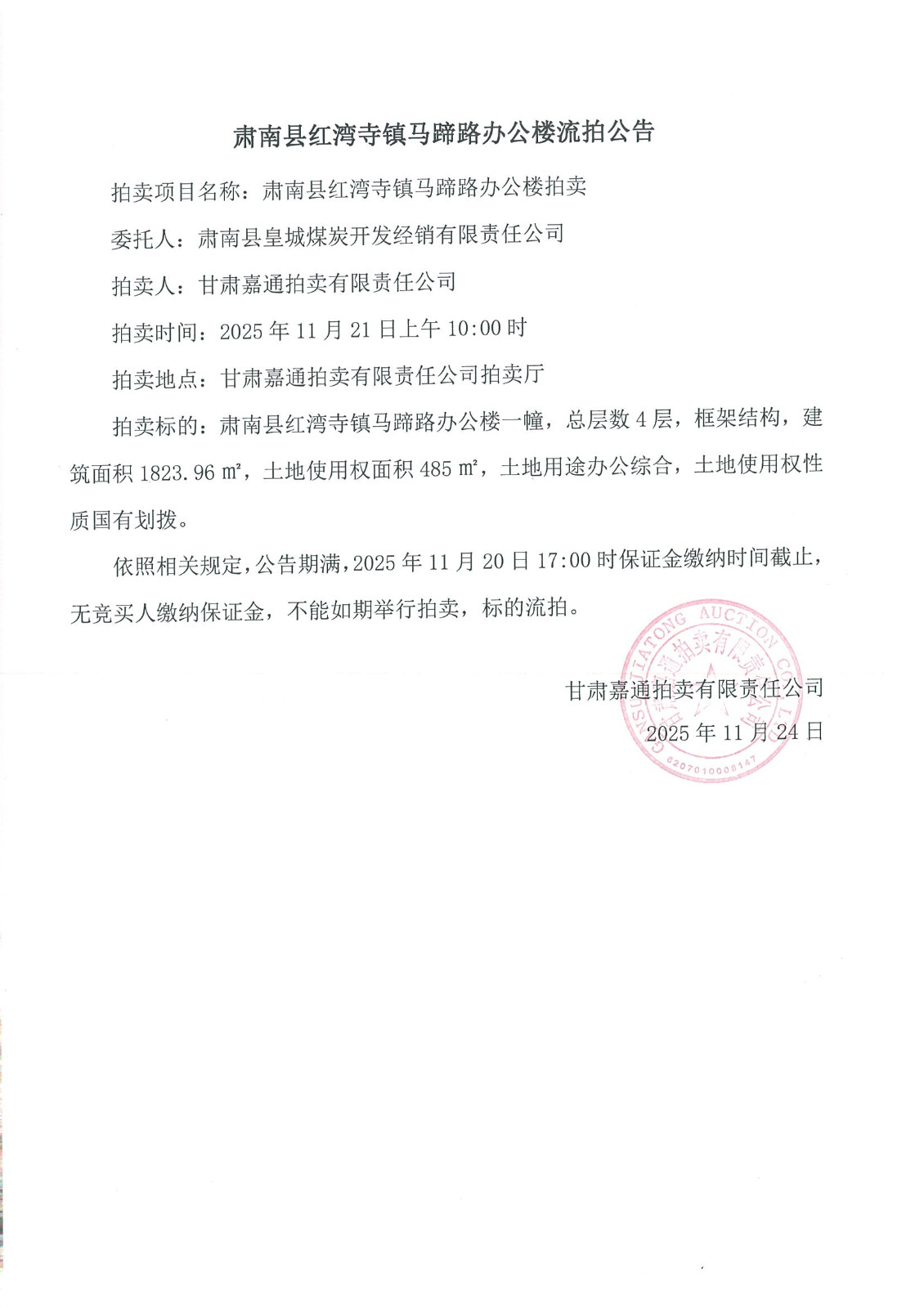 肃南县红湾寺镇马蹄路办公楼流拍公告