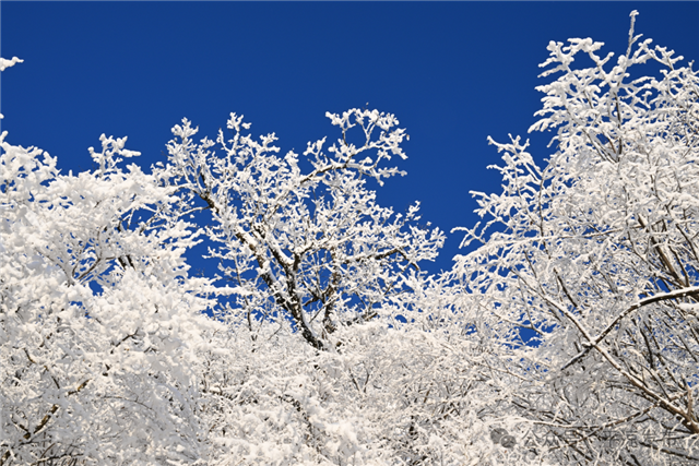 驻足远眺,雪后的崆峒山,是一幅徐徐展开的淡墨长卷。雪以最温柔的笔触,抹去了所有琐碎的细节,只勾勒出最磅礴的轮廓。那些曾显得锐利、充满力量感的楼阁的线条,此刻全被柔化,化作一道道舒缓的弧线,在湛蓝如洗的天空下静静起伏。视线收近,最惊人的造化在于那些树木。所有落尽叶子的乔木与苍劲的古松,它们的千枝万桠,都被琼玉包裹、雕琢,在湛蓝的天幕下舒展成一片晶莹。阳光漫洒,恍如星辰坠落枝头,又似春神提前遣来了万千梨花。“忽如一夜春风来,千树万树梨花开”,这是何等贴切而壮阔的写意。