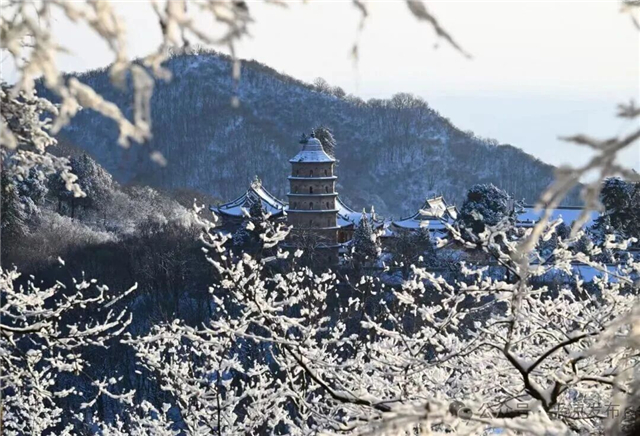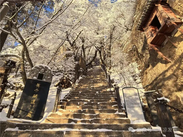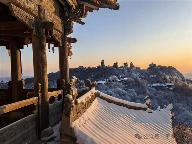 雪中的八台九宫十二院更显沉静与沧桑。整座山屏息着,唯有清冽的空气,携着松针与冰雪的冷香,徐徐拂过。尘世的纷扰在此戛然而止,只剩下一颗心,随着那雪光,一同明净。有游人站在观景台边拍照,呵出的白气在空中短暂停留,又散开。说话声也轻,怕惊动了这份安静。其实没什么可惊动的,雪带走了所有杂音,只留下脚步压碎雪粒的脆响,和偶尔传来的滴水声。