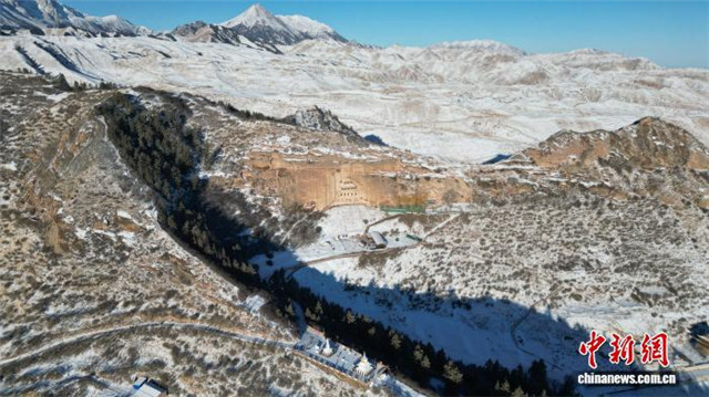 2025年12月22日,航拍下的马蹄寺石窟群银装素裹。