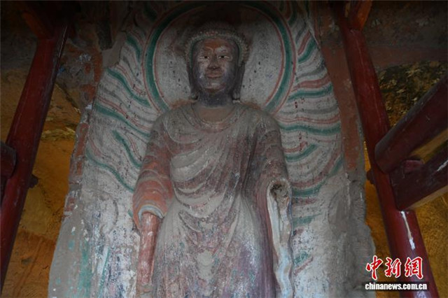 图为马蹄寺石窟群窟龛里的彩塑。