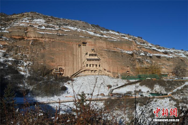 图为崖壁上的千年石窟在白雪映衬下更显古朴沧桑。