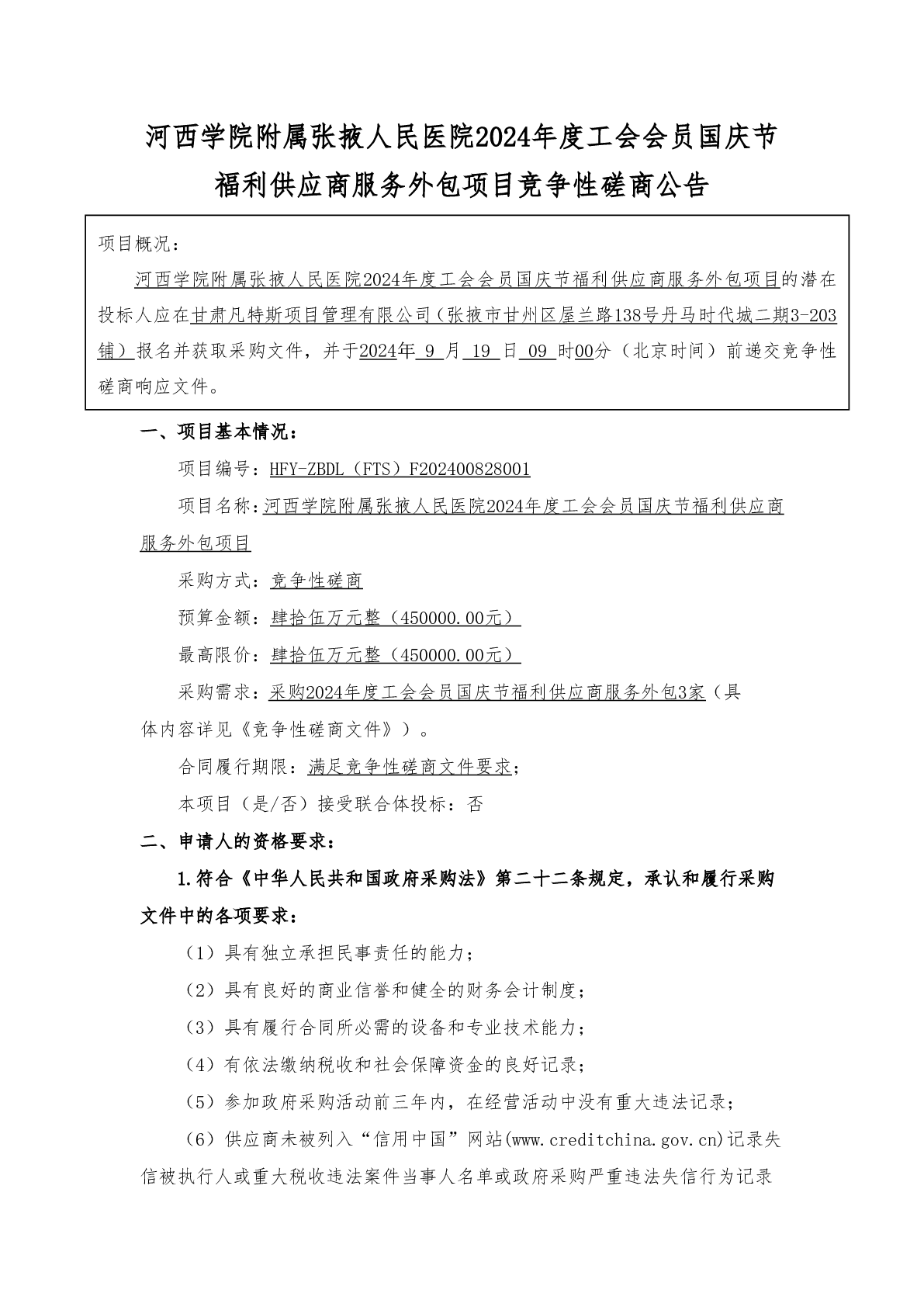 河西学院附属张掖人民医院2024年度工会会员国庆节福利供应商服务外包项目竞争性磋商公告