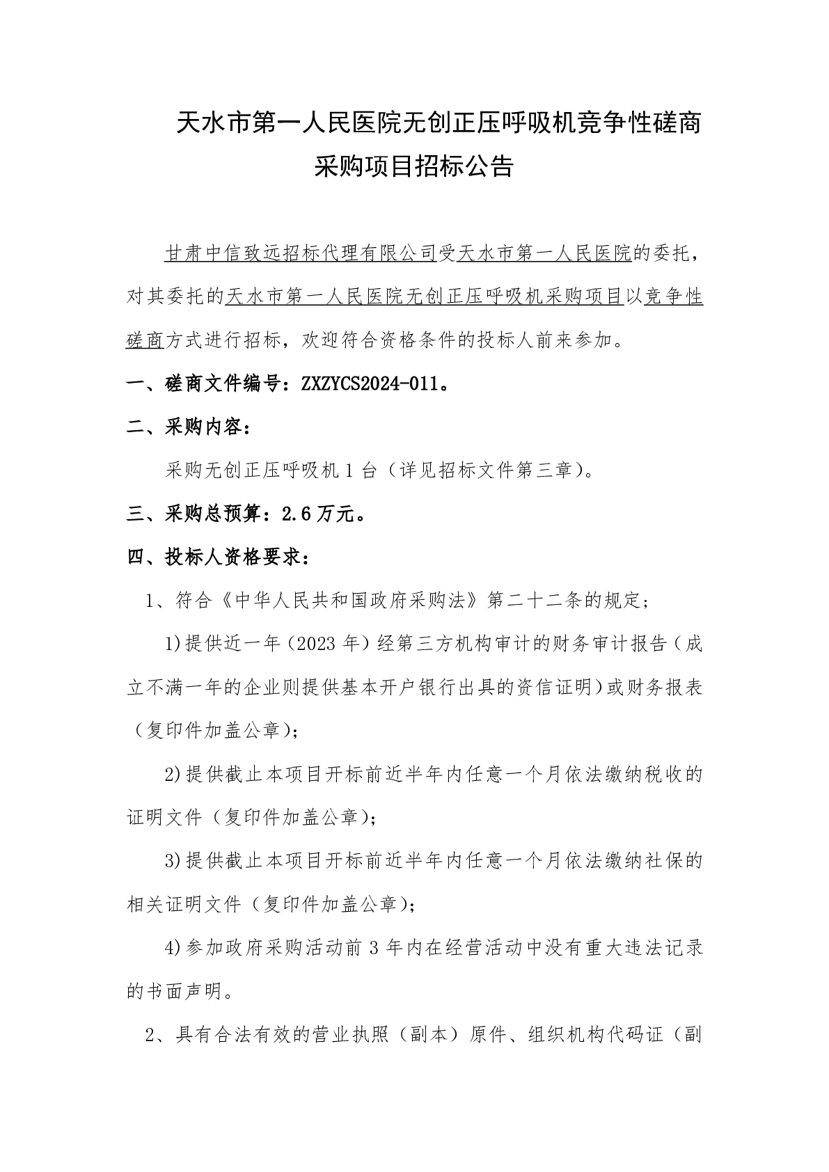 天水市第一人民医院无创正压呼吸机竞争性磋商采购项目招标公告