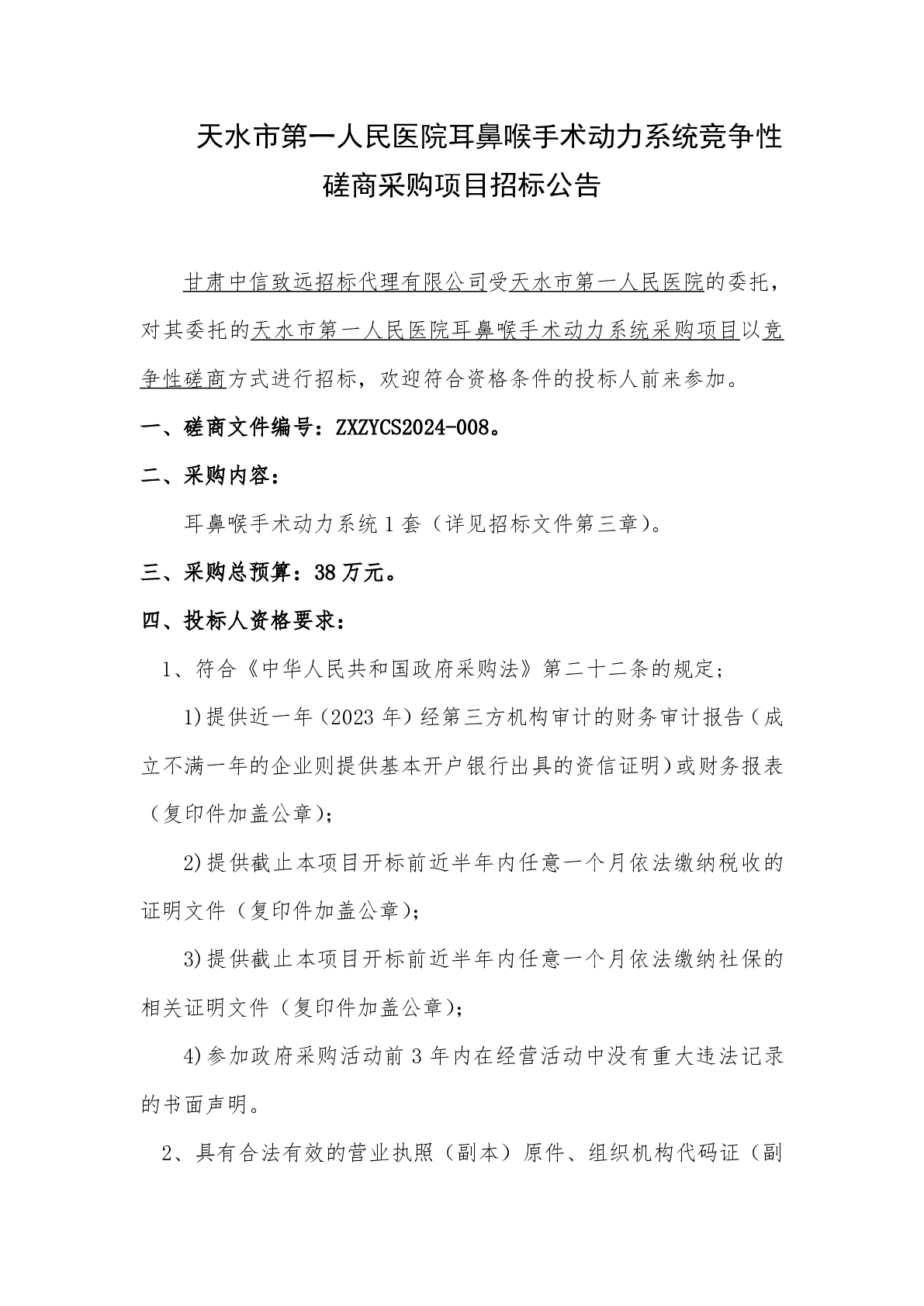 天水市第一人民医院耳鼻喉手术动力系统竞争性磋商采购项目招标公告