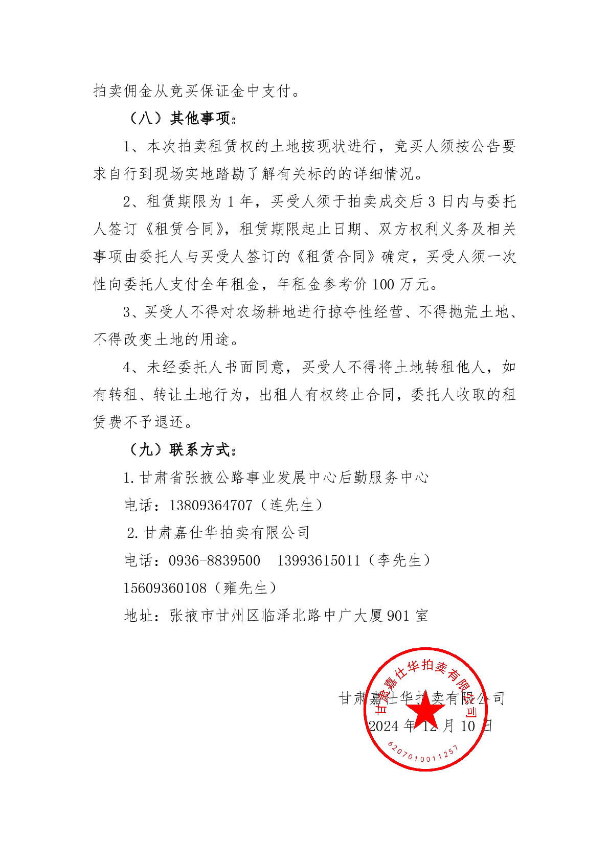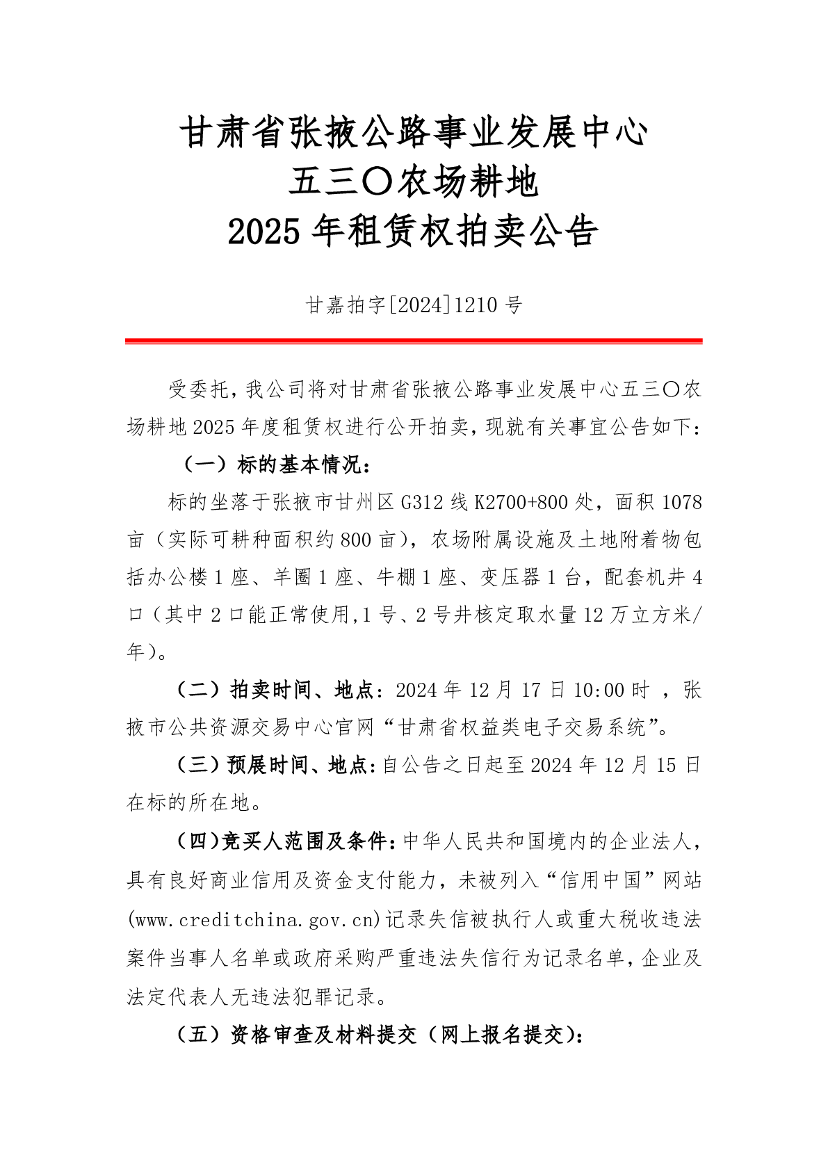 甘肃省张掖公路事业发展中心五三〇农场耕地2025年度租赁权拍卖公告