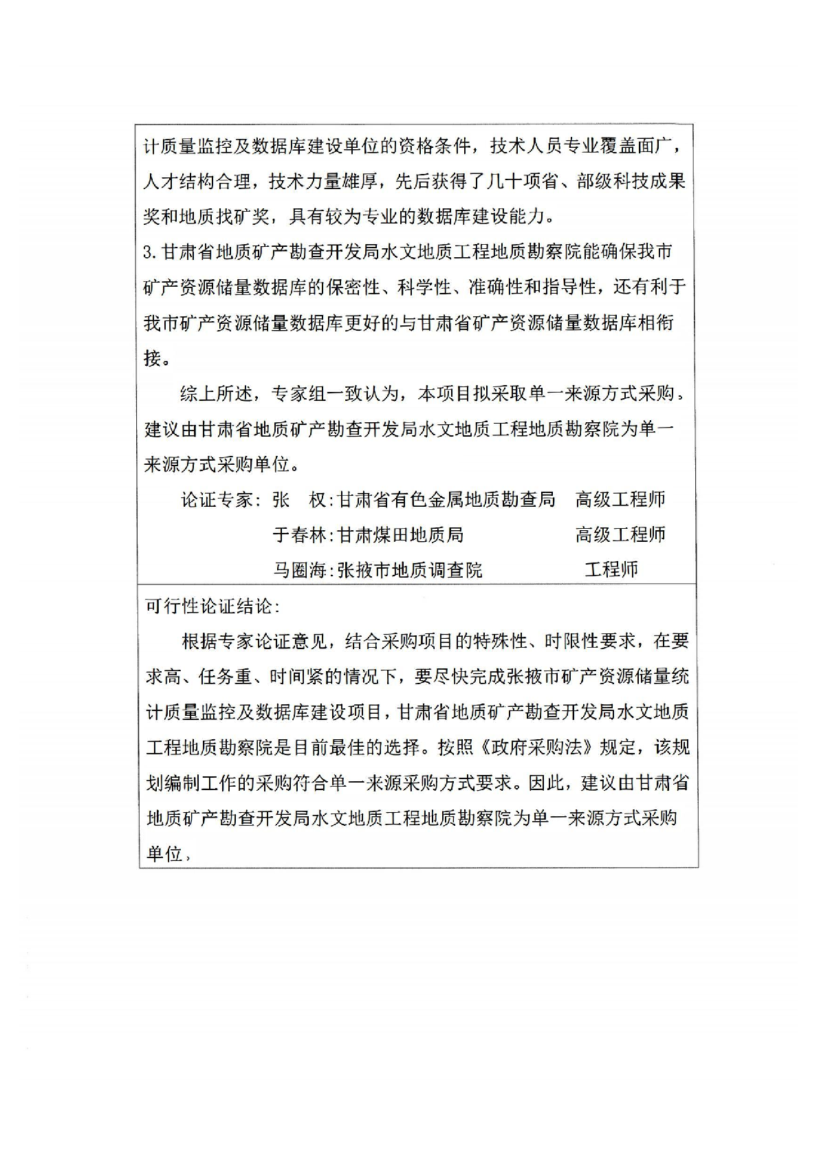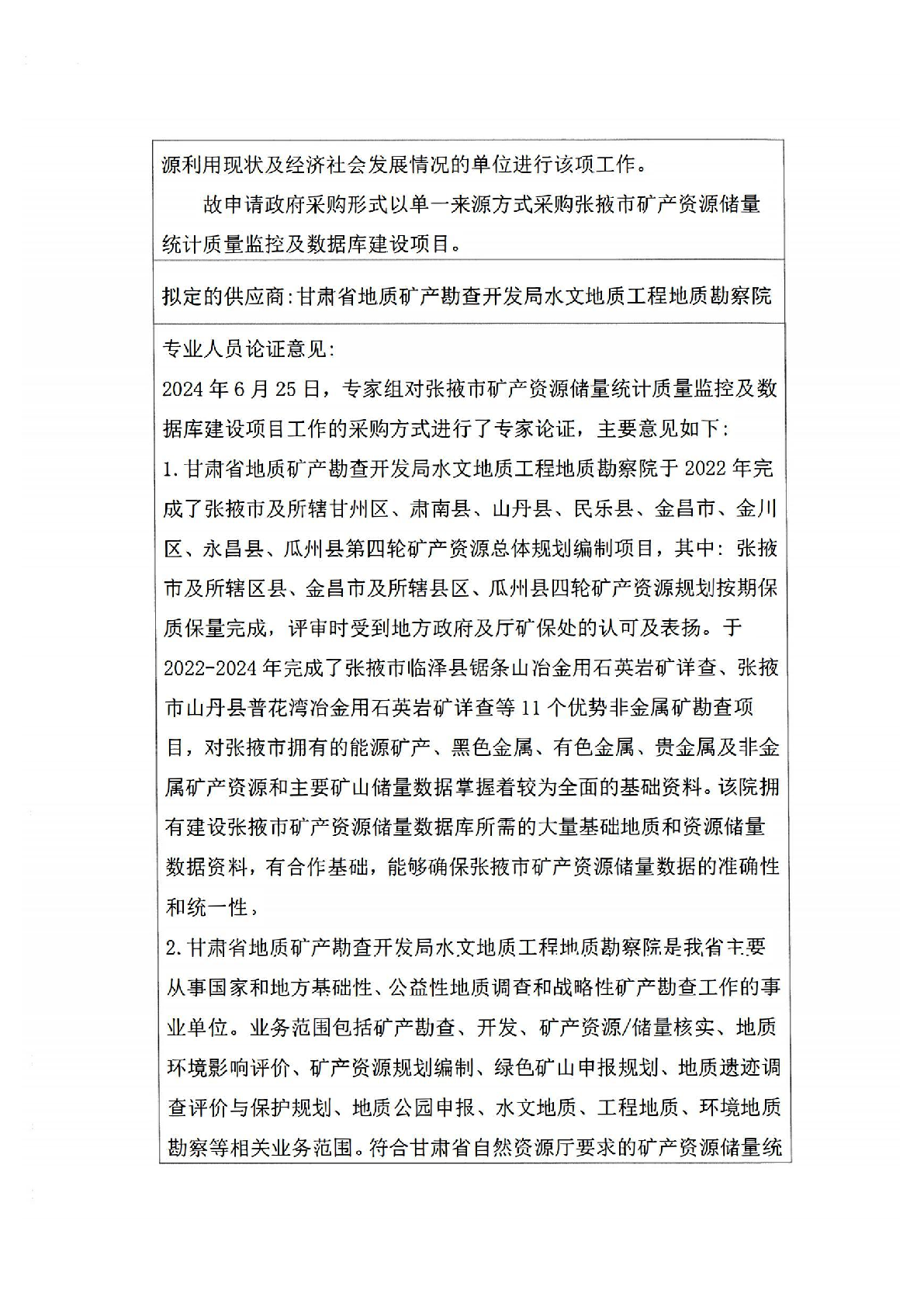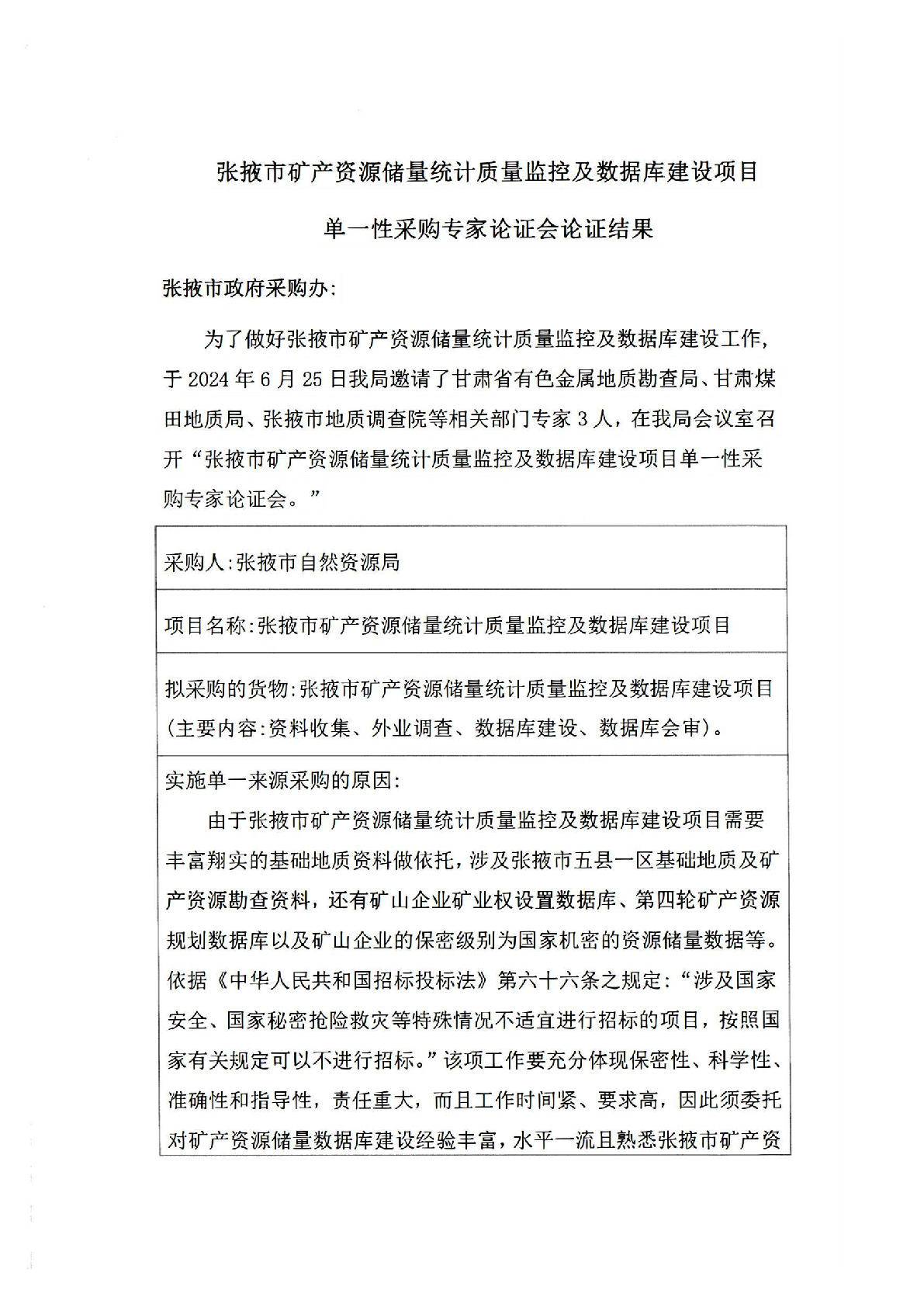 张掖市矿产资源储量统计质量监控及数据库建设项目单一来源采购公示