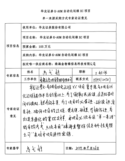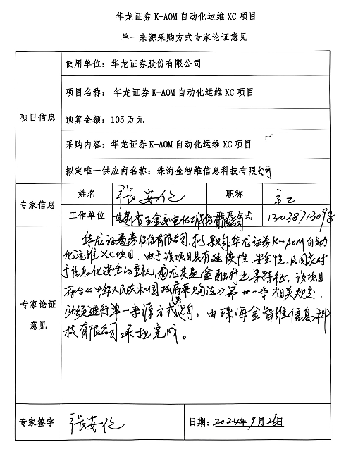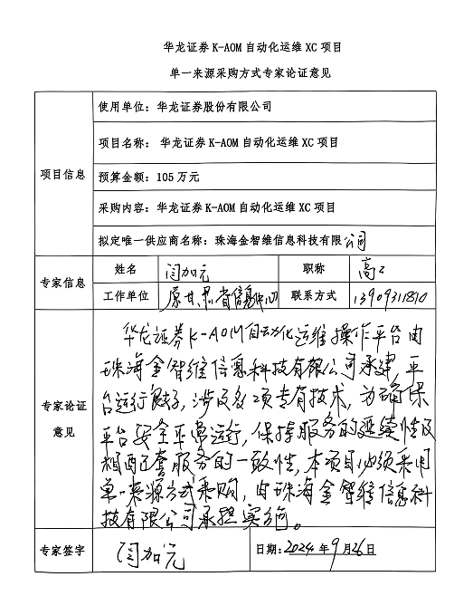 华龙证券K-AOM自动化运维XC项目 单一来源公示