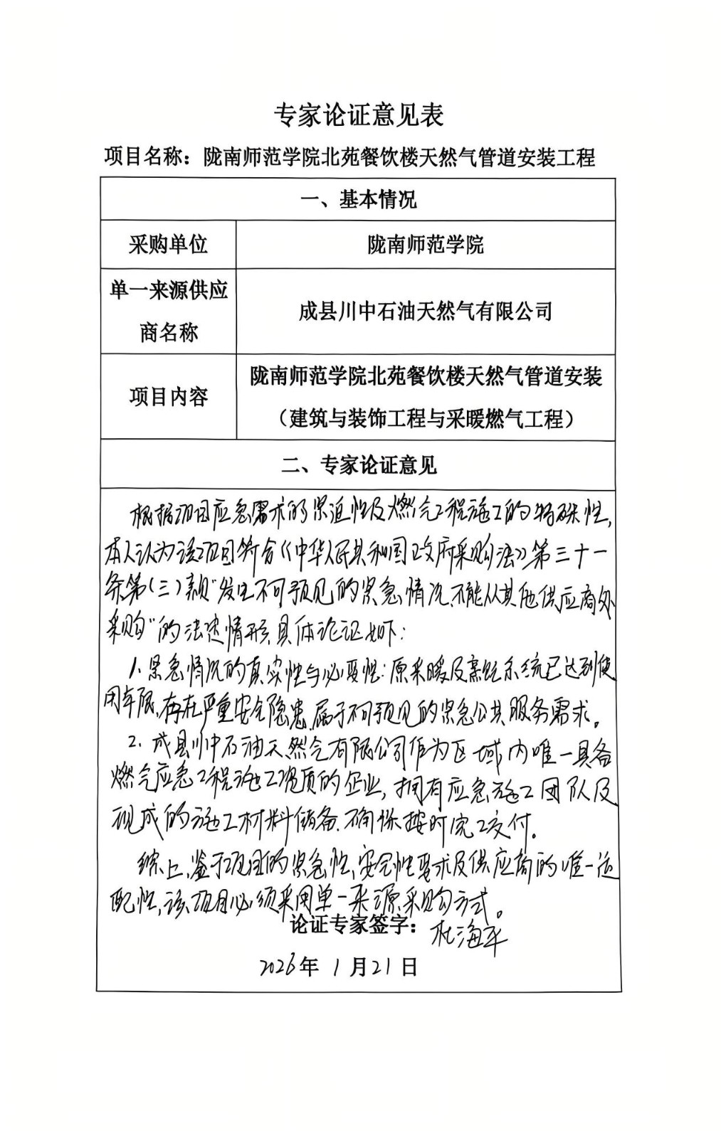 5、采用单一来源采购方式的原因及说明:经核查项目技术文件、地方行业管理规定及市场供给情况,该项目符合《中华人民共和国政府采购法》第三十一条第(一)款“只能从唯一供应商处采购” 的法定情形,天然气管道安装及燃气接入服务属于公共服务类项目,根据陇南市人民政府关于管道燃气特许经营的相关批复,成县川中石油天然气有限公司已依法取得项目所在地管道燃气特许经营权,特许经营期限内为该区域唯一合法的管道燃气供应商。项目所需的气源接入、管网规划、安全监管等核心服务均依赖特许经营权载体,其他市场主体无合法资质开展此类业务。