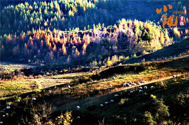 山川被染成一片耀眼的金黄,宛如大地披上了柔软的绒毯。一群群牛羊散落其中,如同大地写下的诗句,一行行、一段段,在彩色的大地上书写着属于自然的韵律。