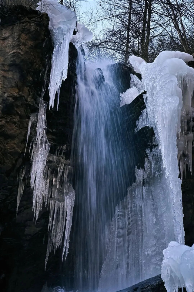 抬头望去,数十米高的冰瀑从悬崖峭壁间垂挂而下,宛如凝固的银河,在阳光的照耀下折射出晶莹的光芒。那些平日里奔腾不息的溪流,此刻也化作了冰封的玉带,在山谷间静静流淌。偶尔有未结冰的湖泊,倒映着岸边的老树,澄澈得如同一块碧绿的翡翠。
